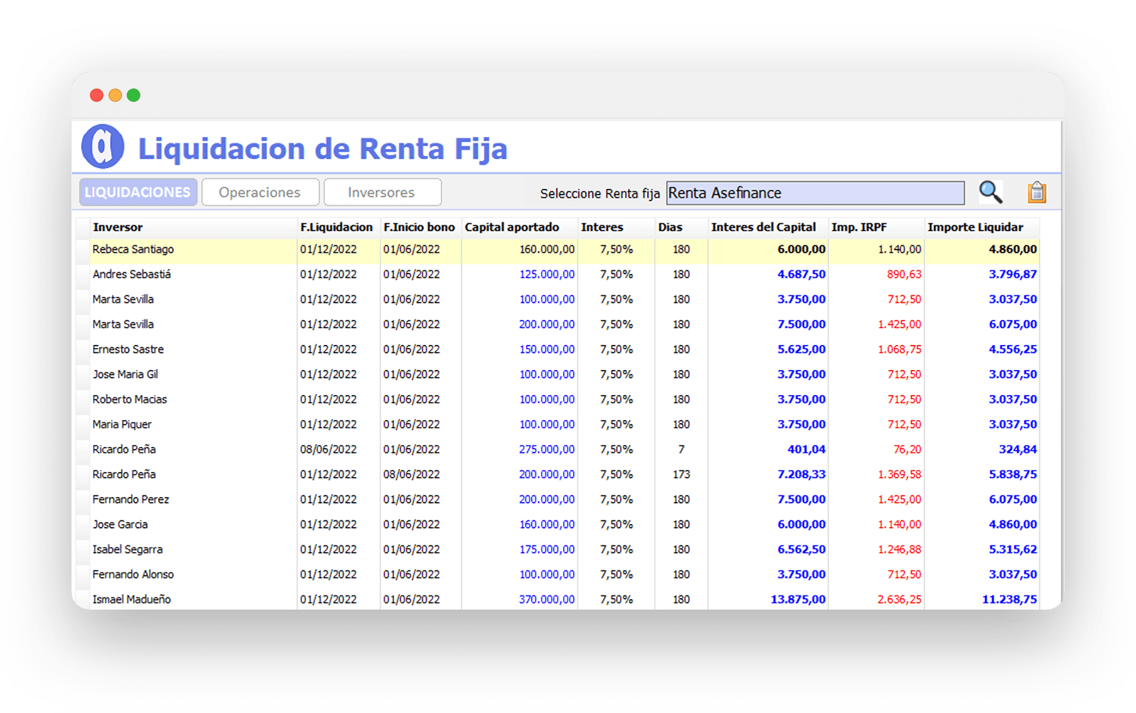 Desde la ventana de liquidación de renta fija, el sistema nos detallará la cuota a ingresar a cada uno de los inversores según sus aportaciones y descontando el IRPF si fuera el caso.